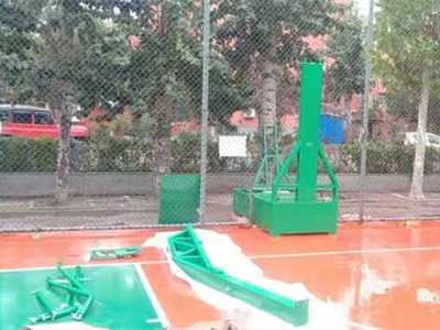 昨天下雨,我们浩然体育安装师傅在山东某中学篮球场,雨中安装室外平箱式篮球架。