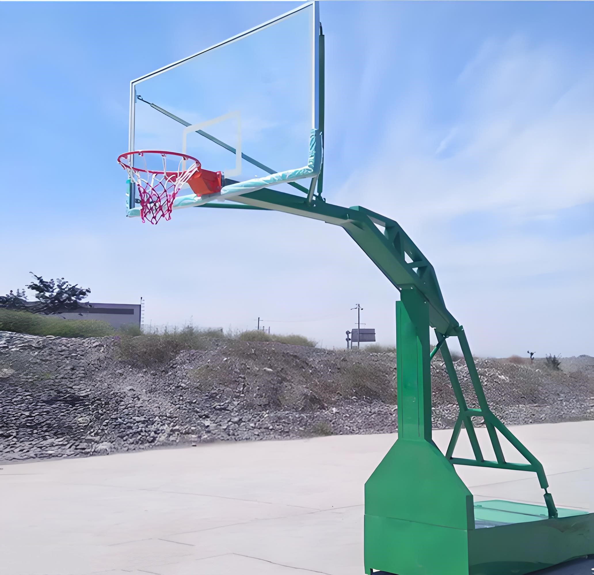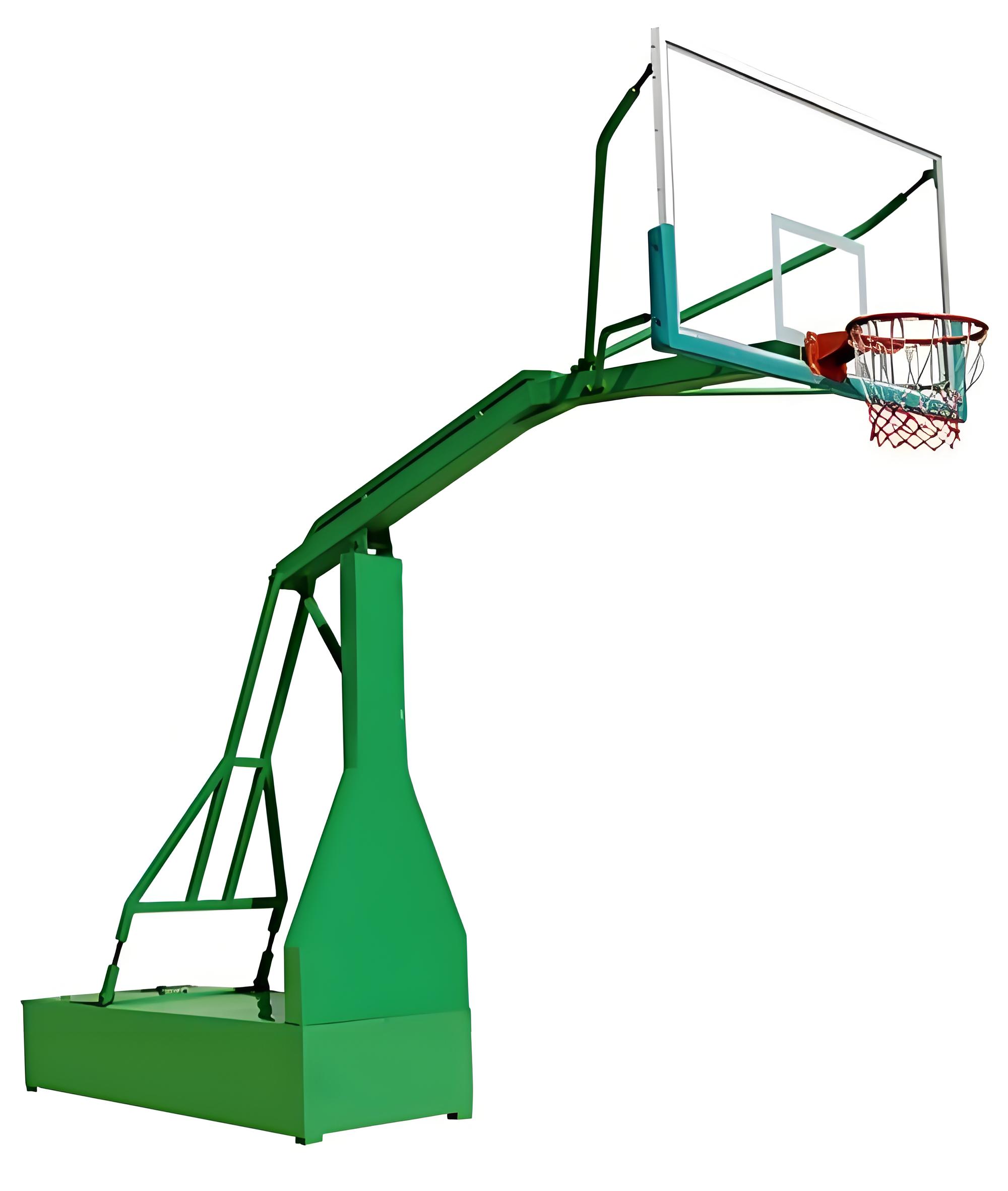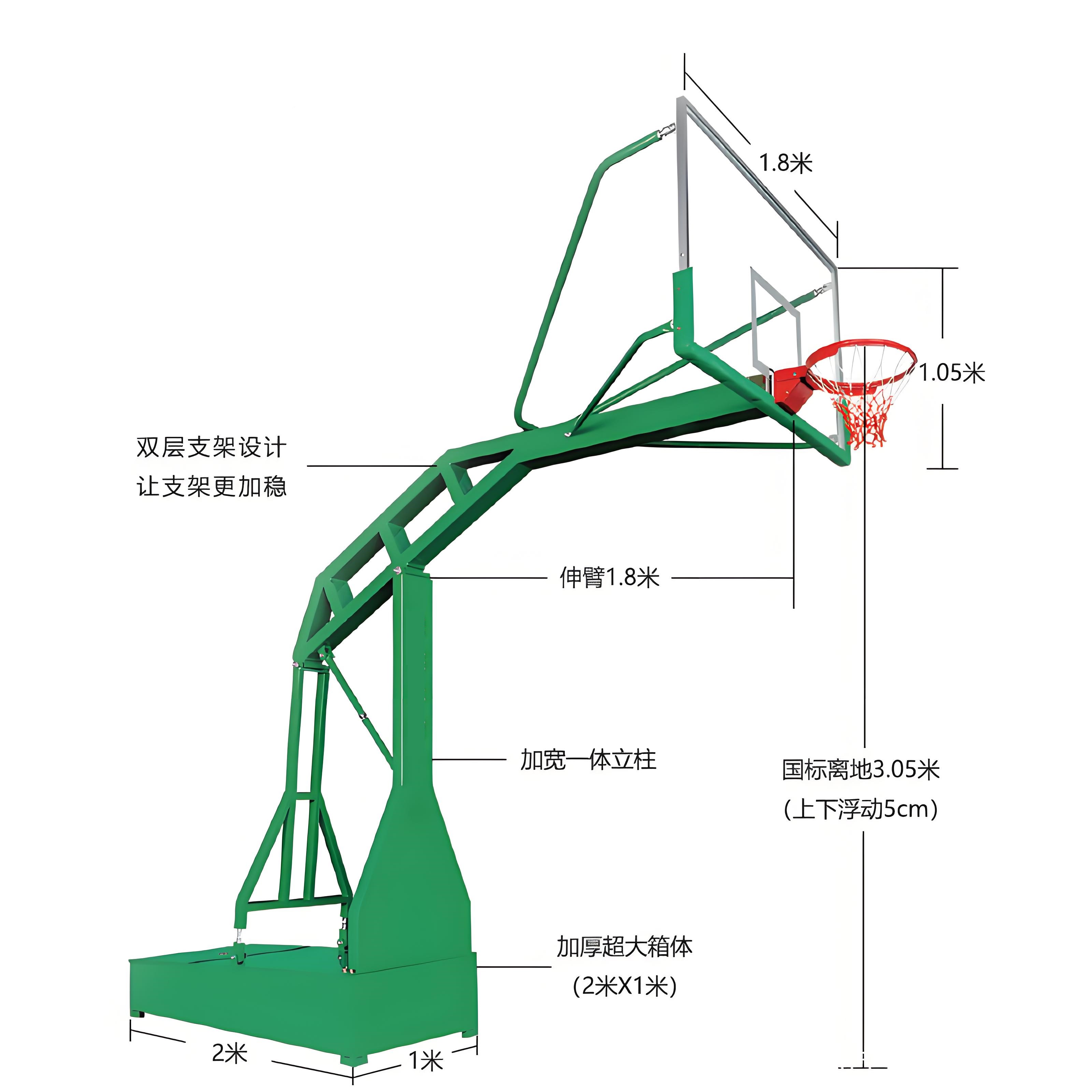篮架伸臂≥2250mm,篮圈上沿离地面高2700mm±8mm;篮板规格:1800mm×1050mm,高强度安全钢化玻璃篮板,篮板外框采用40mm×40mm铝合金型材,并在篮板下沿安装安全保护条。篮筐采用Φ18mm实心圆钢制作,双簧设计,圈下均匀焊有十二个成型挂钩,间隙不大于8mm,抗弯性能好。配尼龙篮球网。产品执行标准GB/T 19851.3-2005。