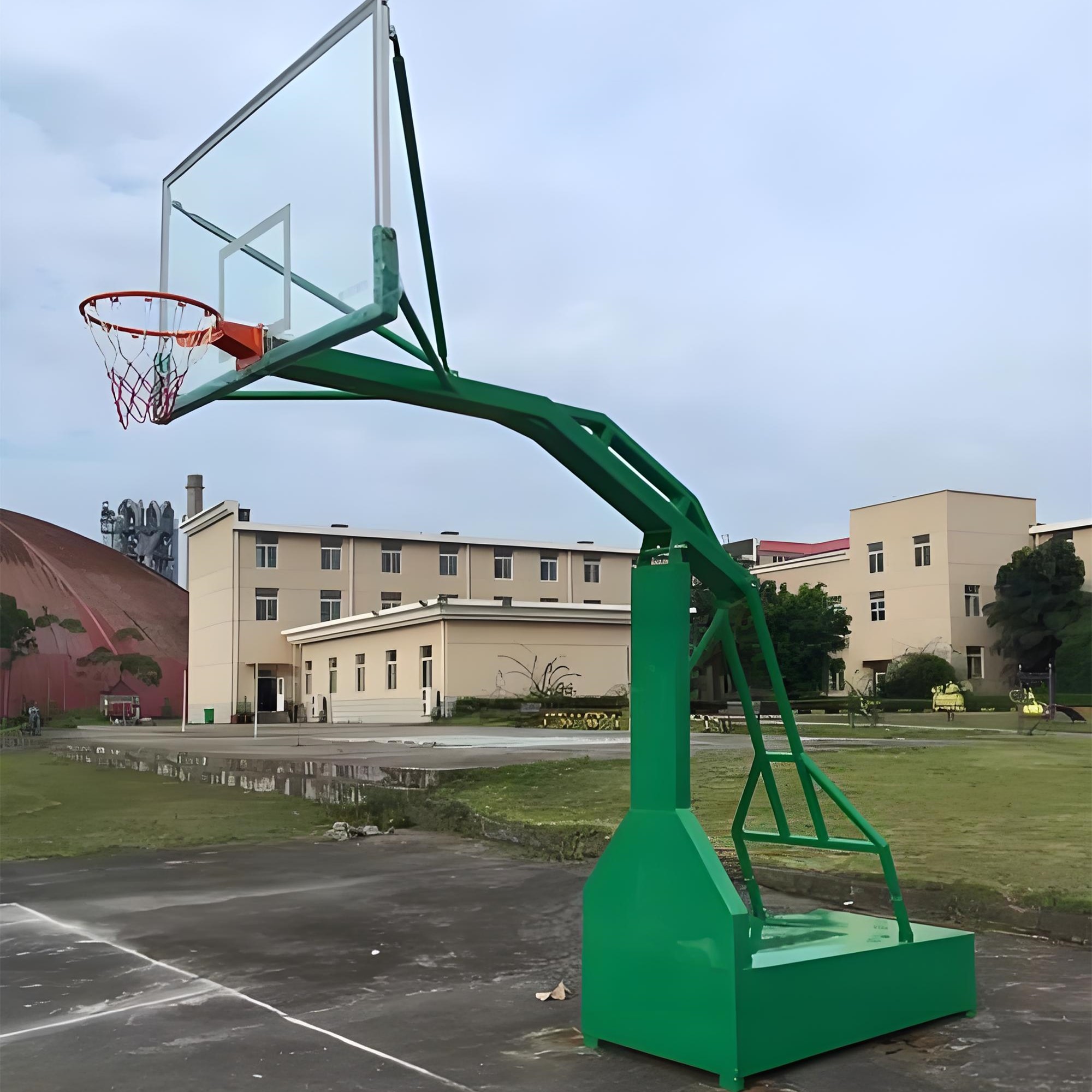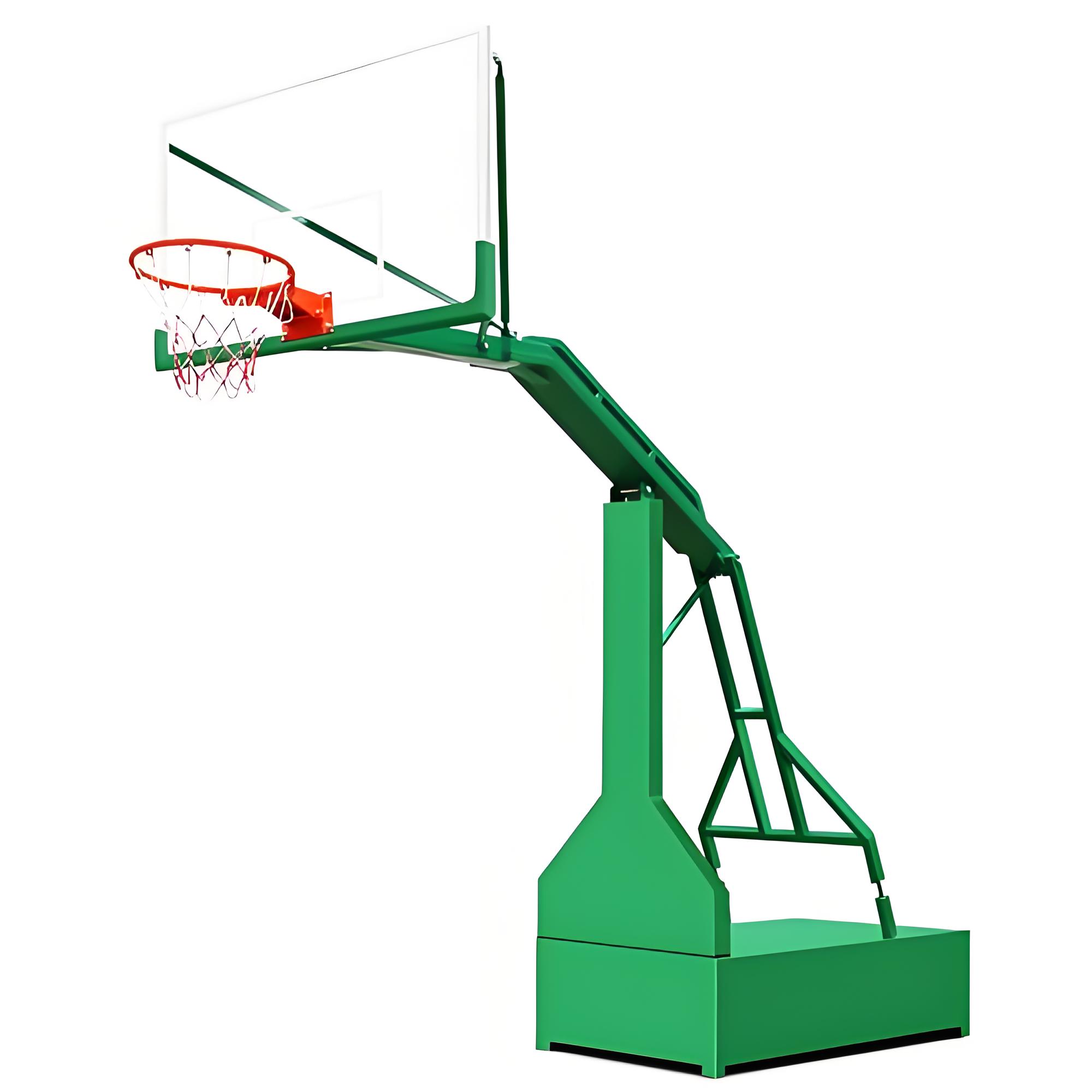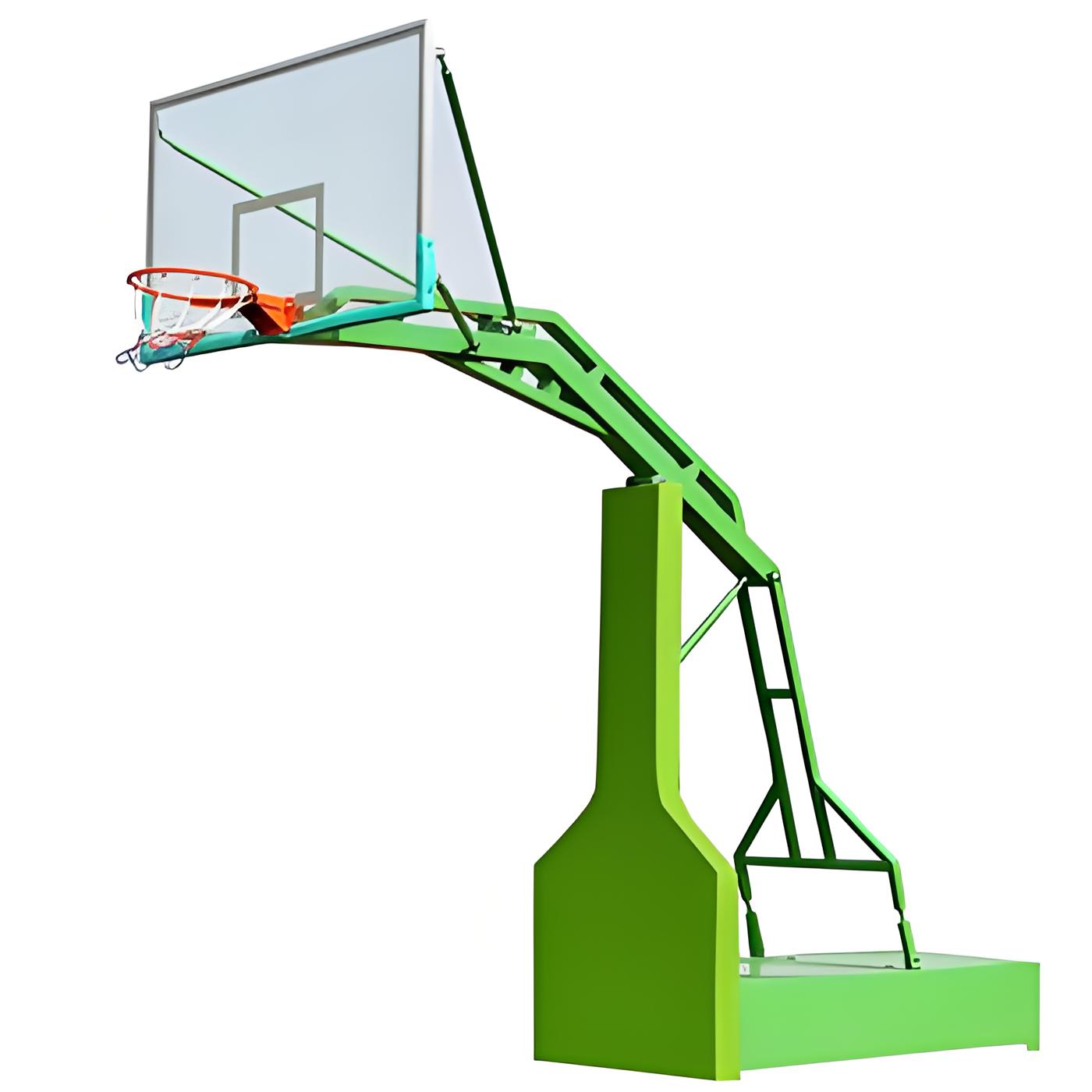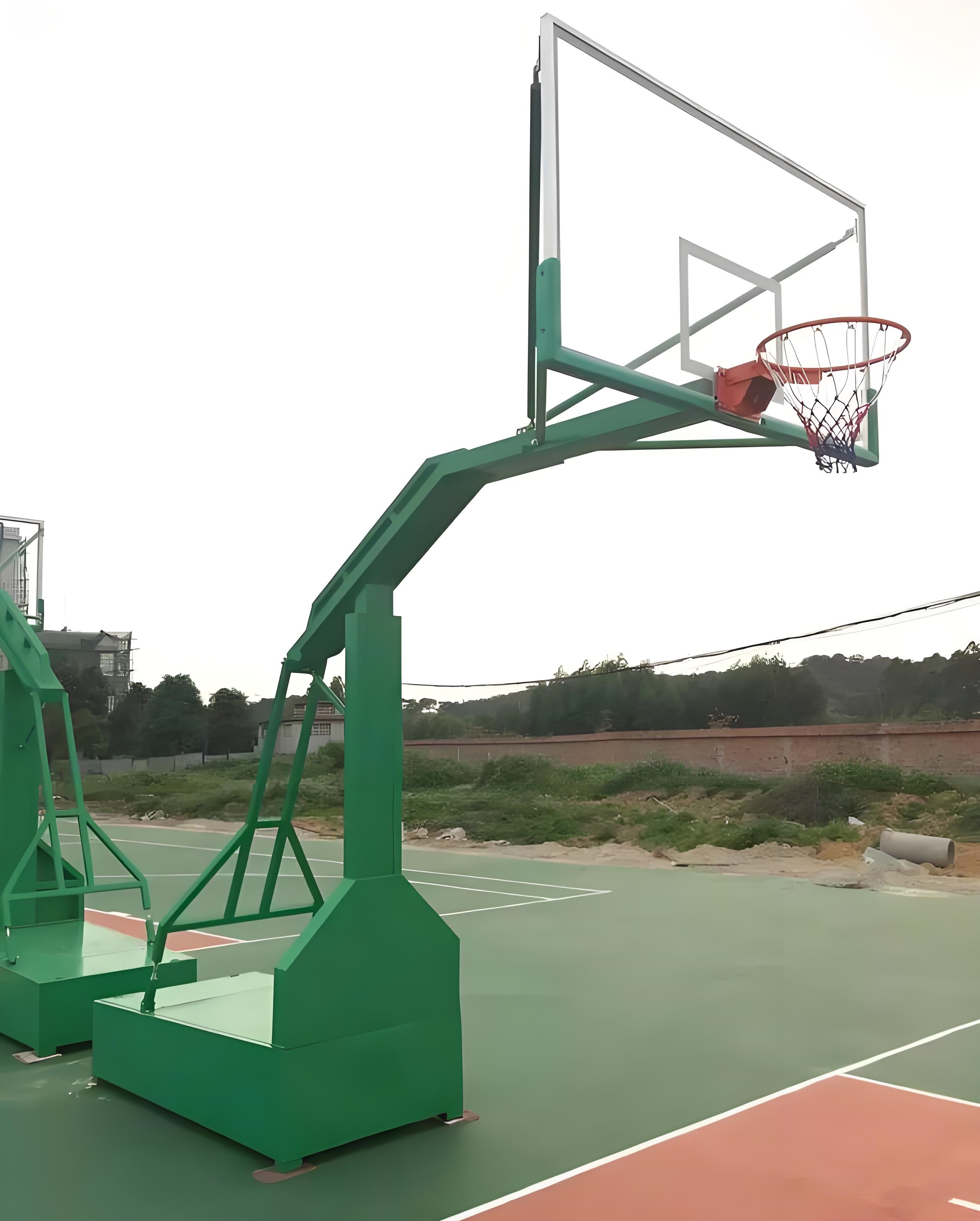 篮架伸臂≥2250mm,篮圈上沿离地面高2700mm±8mm;篮板规格:1800mm×1050mm,高强度安全钢化玻璃篮板,篮板外框采用40mm×40mm铝合金型材,并在篮板下沿安装安全保护条。篮筐采用Φ18mm实心圆钢制作,双簧设计,圈下均匀焊有十二个成型挂钩,间隙不大于8mm,抗弯性能好。配尼龙篮球网。产品执行标准GB/T 19851.3-2005。